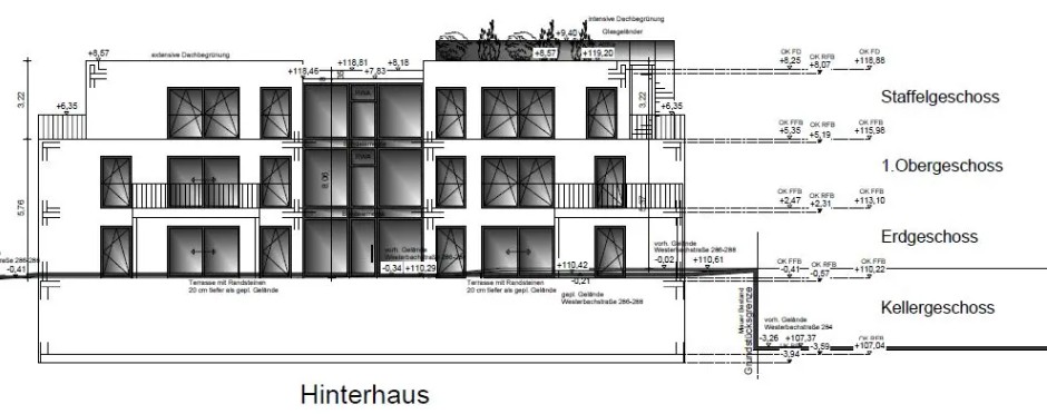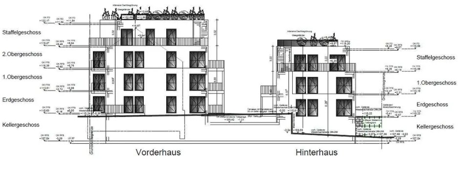 Sie werden von den Dachterrassen und Balkonen weiterhin die Bäume sehen, besonders vom hinteren Baukörper aus. Dort können die Eichhörnchen und die Vögel Sie als neuen Nachbarn besuchen.