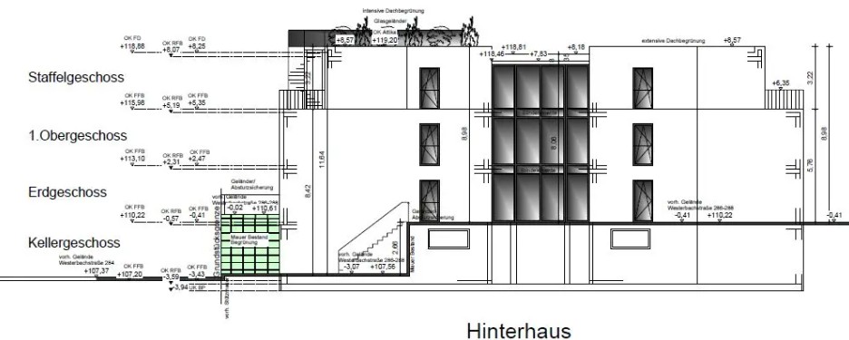 Es handelt sich um zwei Baukörper mit begrüntem Innenhof. In Kürze wird das vorhandene Gebäude abgerissen.
