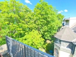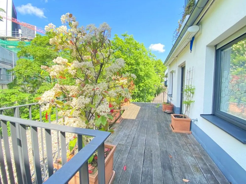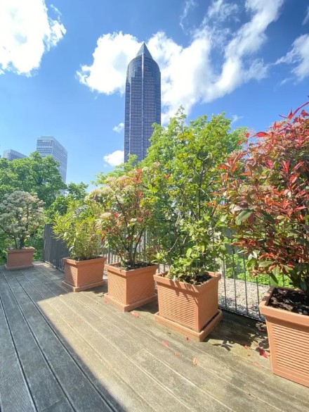 Von der großen Dachterrasse von 15,64m² haben Sie nicht nur den Blick in das ruhige Grüne, sondern auch auf den berühmten Frankfurter Messeturm.