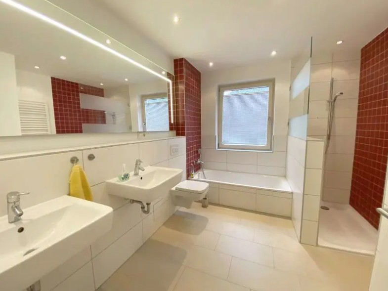 Auch das zeitlose Tageslichtbad wird jeden Ansprüchen gerecht, da es eine Wanne, eine Dusche und zwei Waschbecken mit einem großen beleuchteten Spiegel besitzt.