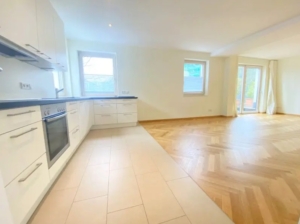 Zur Ausstattung gehört eine hochwertige Einbauküche. Direkt daneben befindet sich ein Hauswirtschaftsraum mit Waschmaschinenanschluss.
