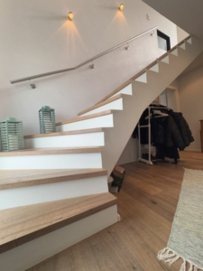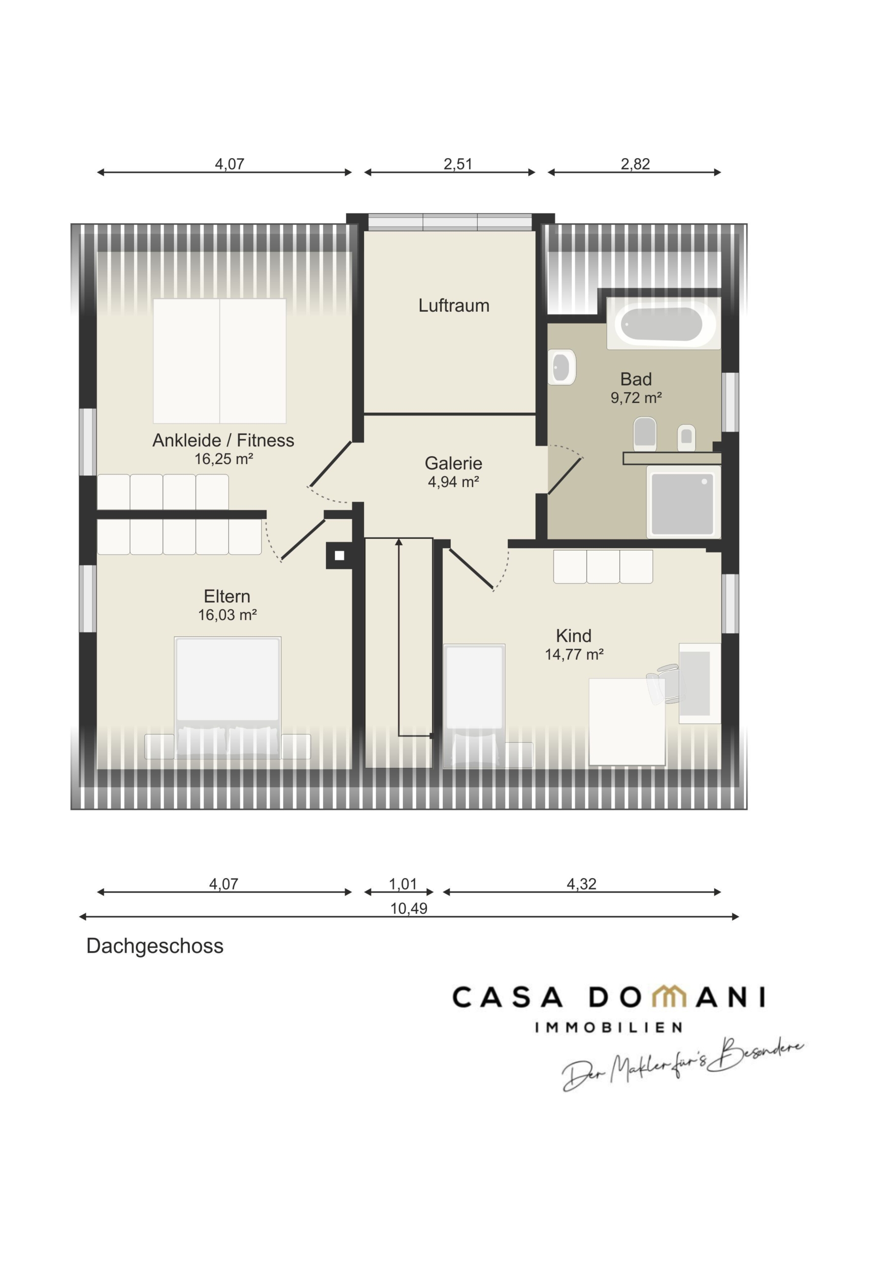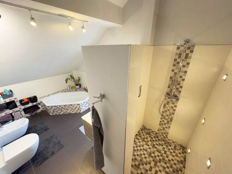 Die 2-3 Kinder haben im Dachgeschoß ein großes Bad, eine Galerie mit dem Luftraum nach unten und können mit einem Blick nach unten sehen, wenn das Essen auf den Tisch kommt.