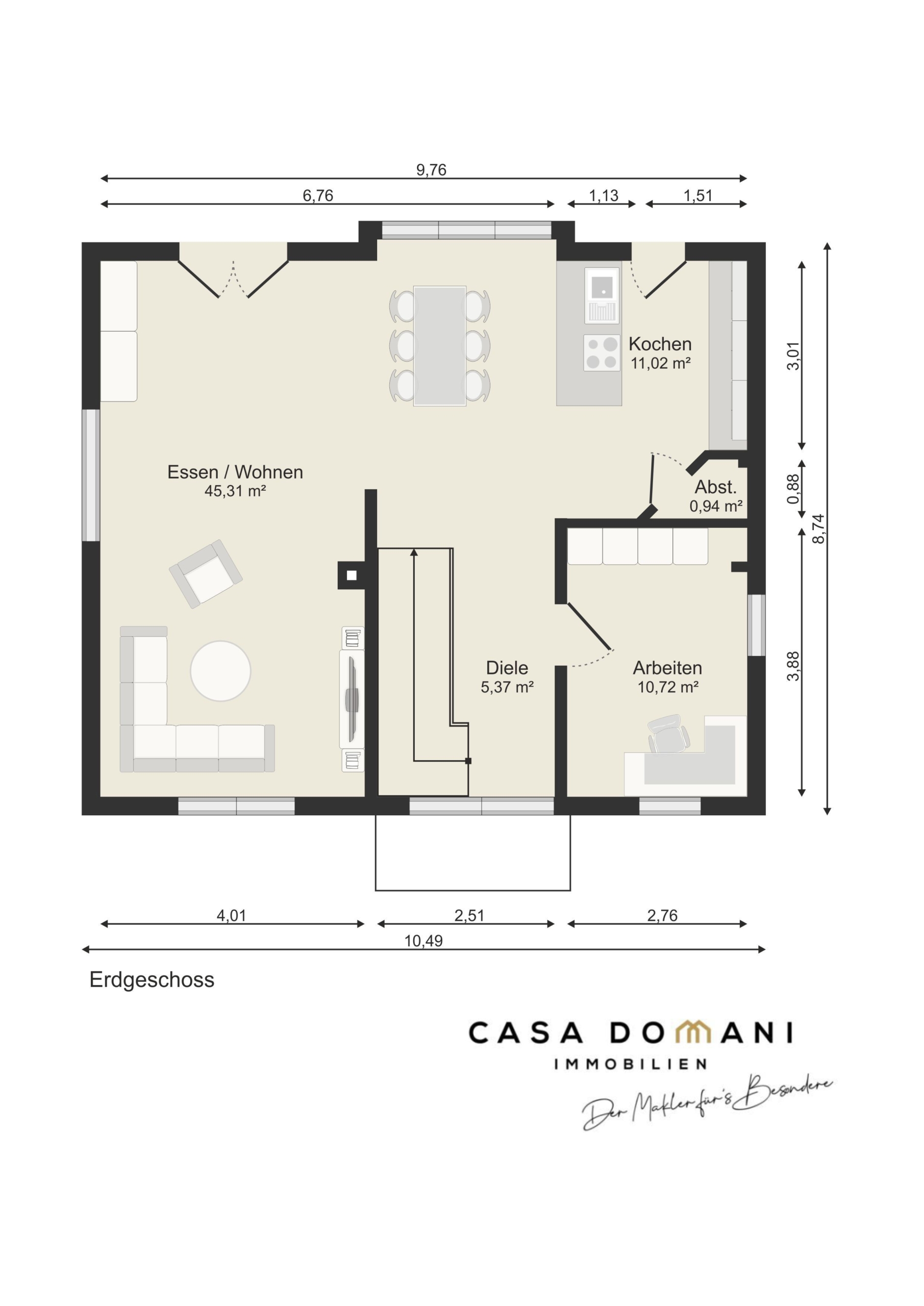 Das Erdgeschoß mit ca. 72m² hat schon damals ein Home-Office von ca. 10m² erhalten. Durch die Schiebetüren aus dem Luftraum betreten Sie die große Terrasse und den Garten, der an eine grüne Wiese angrenzt.