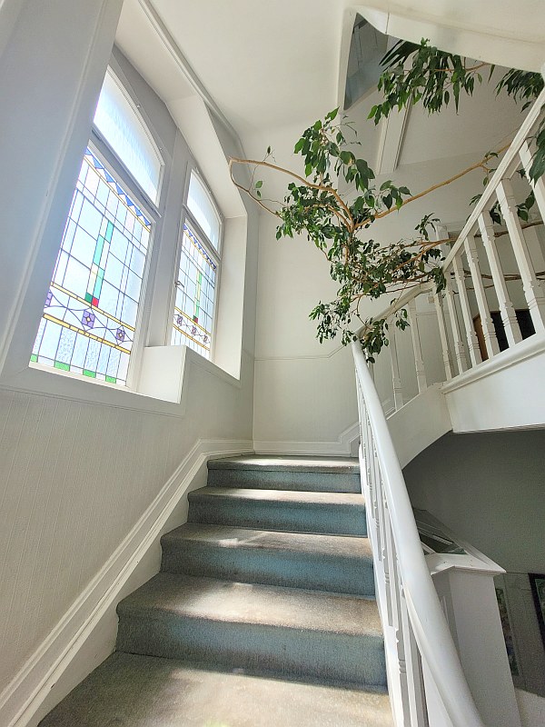 Auf diesem gepflegten Grundstück steht die Altbauvilla mit Buntglasfenstern und dem schönen hellen Treppenhaus.