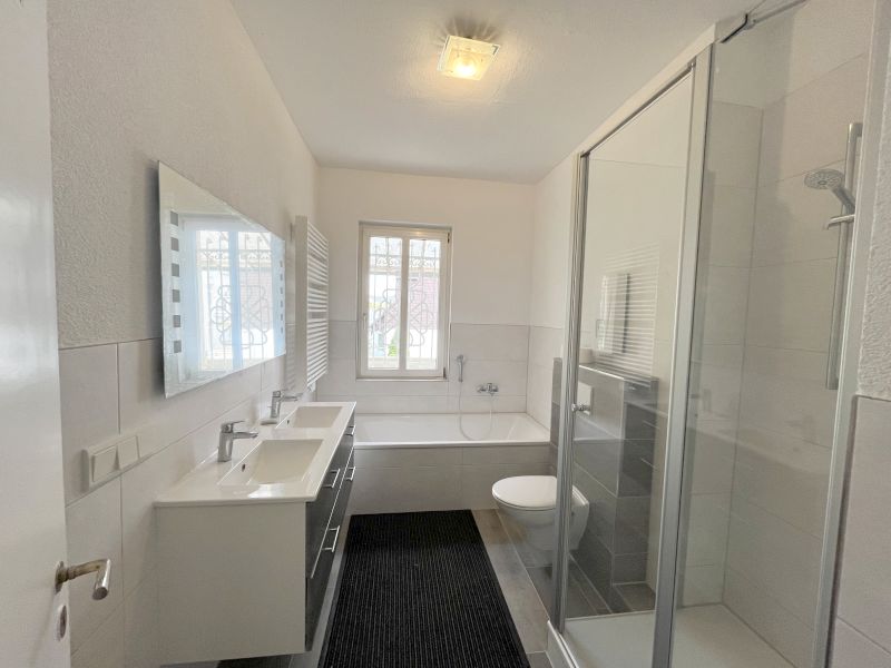 Das neu sanierte Badezimmer wurde mit hochwertigen Materialien versehen und bietet neben einer Badewanne auch eine Dusche, zwei Waschbecken und moderne großformatige Fliesen – eine wahre Wohlfühloase mit zeitgemäßem Design.