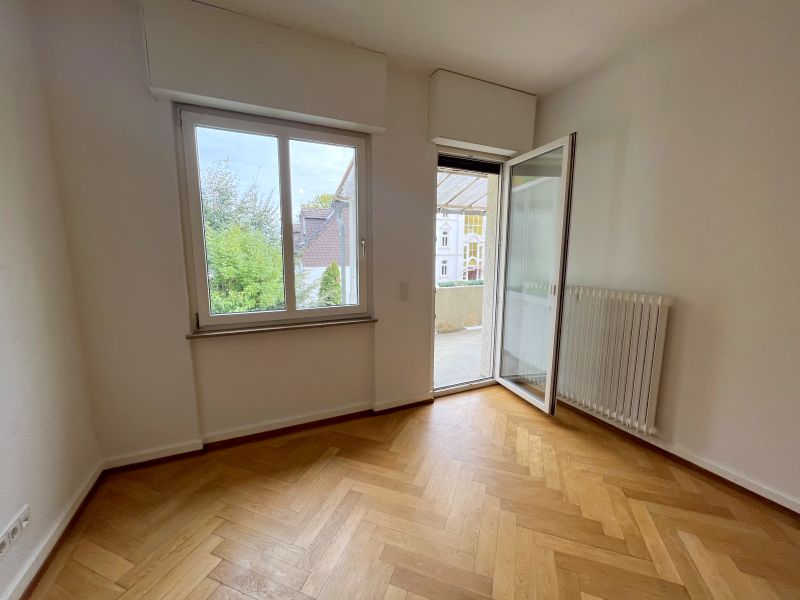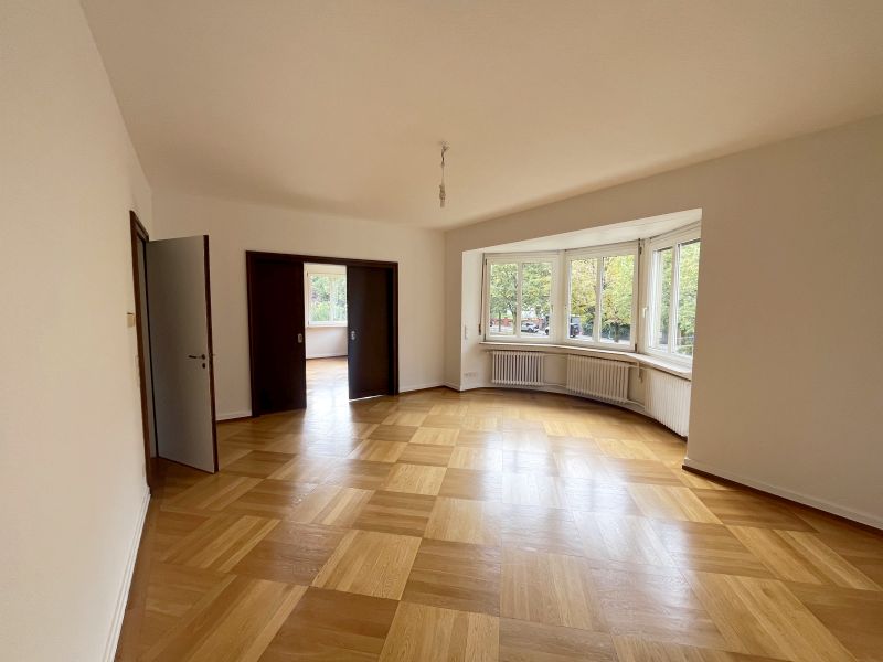 Der Wohnbereich beeindruckt mit seiner Helligkeit und einem stilvollen Erker, der dem Raum eine besondere Atmosphäre verleiht. Eine Schiebetür führt in ein angrenzendes weiteres Zimmer, das sich ideal als Esszimmer oder zweites Schlafzimmer eignet.