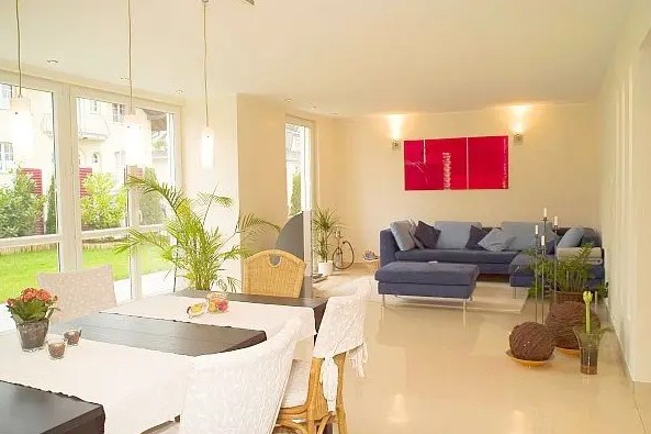 Durch die Fensterfront fällt viel natürliches Licht ein.