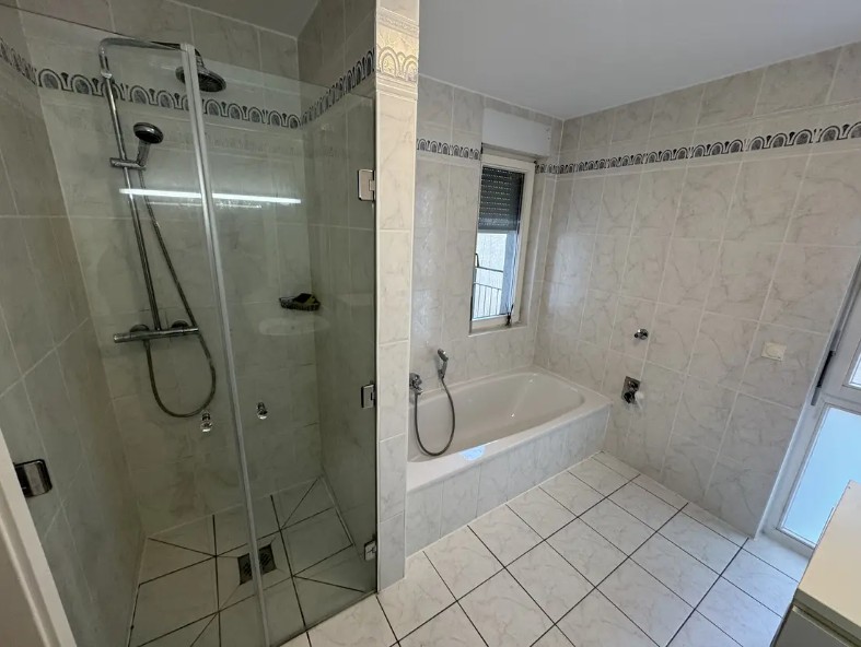 Das weiße Bad mit Wanne und begehbarer Dusche hat zwei Tageslichtfenster.