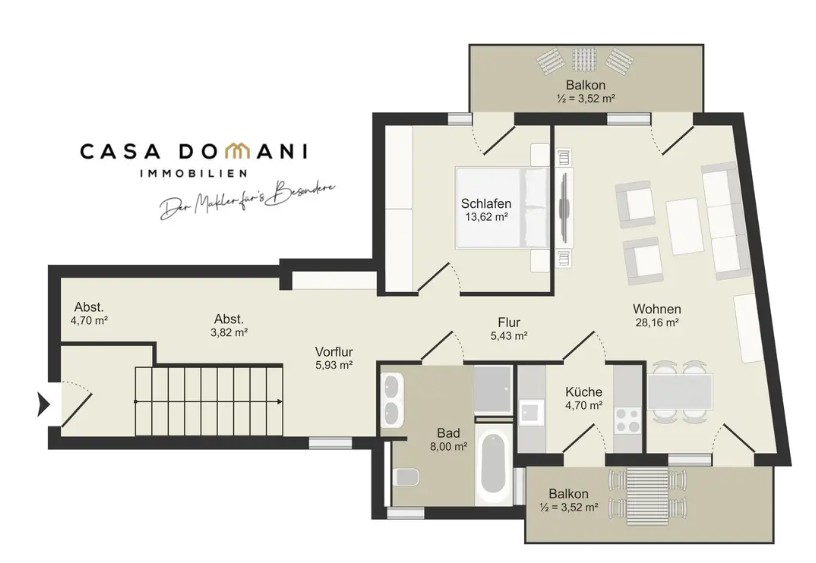 Die ca. 80m² große Wohnung hat einen individuellen Grundriss mit einem großen Wohn/Essbereich.