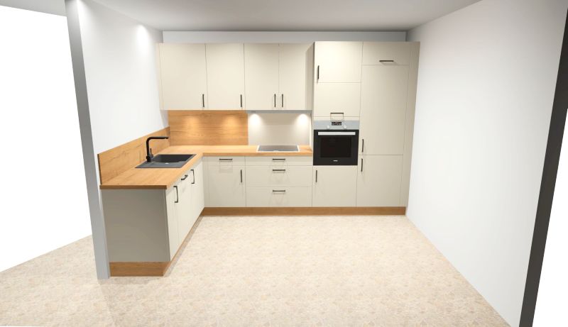 Der Wohnbereich ist großzügig gestaltet, hell und funktional. Die moderne Einbauküche fügt sich stimmig in das offene Konzept ein.